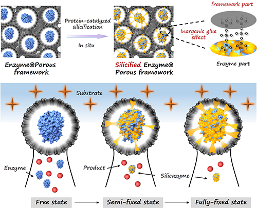 硅基基质具有化学惰性、机械强度高和热稳定性好等优良特性而被广泛用于酶固定化。朱伟教授团队长期致力于硅基基质在酶固定化及调控生命体活动等方面的研究,并取得了一系列成果(PNAS. 2024, 121, e2408273121; PNAS. 2024, 121, e2322418121; Angew. Chem. Int. Ed. 2024, 63, e202406110;Nat. Rev. Bioeng. 2024, 2, 282; ACS Nano 2022, 16, 2164;Nat. Commun. 2022, 13, 6265;J. Am. Chem. Soc. 2021, 143, 17, 6305等)。