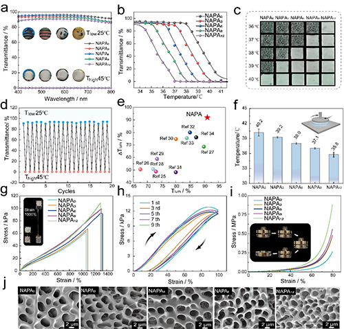 具有pH、温度、湿度等外部刺激响应性的智能水凝胶传感器在医学诊断、环境监测和可穿戴电子设备等领域有着广泛应用。其中,在众多智能水凝胶传感器中,皮肤可贴附的热响应性水凝胶因其独特的响应性、生物相容性和形状适应性引起了相当大的关注。然而,在众多热响应水凝胶传感器中,很少有能根据体温触发来实现其光学及粘附性质的改变,这进一步限制了水凝胶传感器在可穿戴器件领域的应用。为此,开发同时具有体温响应、粘附适应性和透明度可调的可穿戴水凝胶结构器件至关重要。
