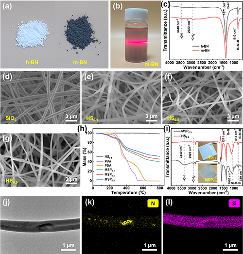 目前,分别选择使用SiO2纤维膜作为隔热材料和氮化硼(BN)作为被动辐射制冷(PRC)填料的研究报道较多。然而,由于BN的本征高热扩散系数,使其在隔热领域的应用中具有严重局限性。所以如何有效结合这两种惰性陶瓷材料来构建具有隔热和辐射制冷的双效热管理复合材料具有重大研究意义。