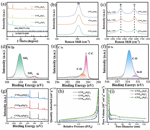 图3:(a) XRD 图谱,(b,c) CNT0.25Si2C2、CNT0.5Si2C2和 CNT0.75Si2C2的拉曼光谱;(d) Si 2p、(e) C 1s 和 (f) O 1s 的高分辨率光谱;(g) CNT0.25Si2C2、CNT0.5Si2C2和 CNT0.75Si2C2的XPS全光谱。(h) 氮气吸附/脱附等温线;(i) Si/MWCNT@C 的孔径分布。