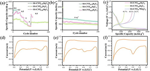 图 五 SS-CNTxSiyCz的电化学性能。(a) 倍率性能;(b) 循环性能;(c) GCD 曲线;(d) SS-CNT0.25Si2C2、(e) SS-CNT0.5Si2C2和 (f) SS-CNT0.75Si2C2在 0.1 mV s–1下的 CV 曲线。