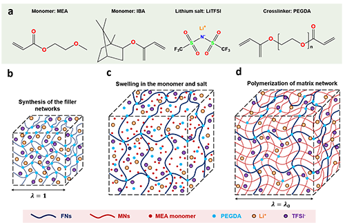 - 随后,填充网络被浸泡在包含MEA单体、锂盐和交联剂的前体溶液中,并在手套箱中平衡溶胀。
