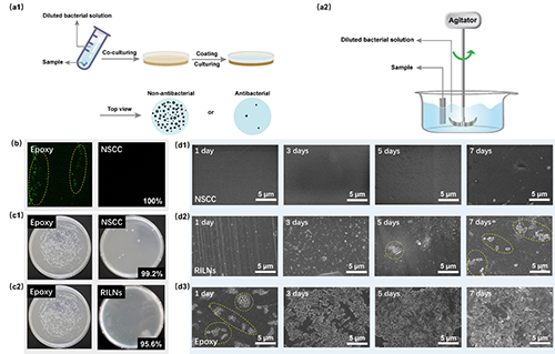 图2. 防污性能. (a1)静态防污和 (a2)动态防污的测试示意图; (b)空白玻璃和涂有NSCC的玻璃的蛋白粘附荧光光谱图; (c1)NSCC和(c2)RILNs的静态抗菌防污效果图; (d1-d3)铜绿芽孢杆菌在(d1)NSCC/环氧基材、(d1)RILNs/环氧基材上动态冲刷不同时间的表面粘附图(SEM).