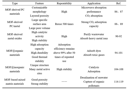 随后文章根据其化学成分,MOF 衍生材料可分为纯 MOF 衍生材料、MOF@有机材料、MOF@无机材料和其他 MOF 基复合材料。并且对比了不同种类MOF衍生材料的特点、可重复性以及应用场景。