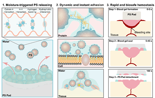 同时,团队已授权两项国家发明专利并正推进这种材料的临床转化,在未来其或将作为战地急救包,对大动脉出血实现一贴即止;作为止血快、易拆卸的外科手术神器,从此告别术后粘连并发症;或作为户外运动、日常创伤的“救命贴”。