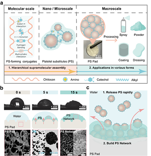 这项研究设计了一种释放替代血小板的纳米颗粒的多尺度超分子材料,其具有模拟血小板的微结构和超越血小板的非特异性结合细胞和蛋白的能力,从而即时地构筑具有多层级结构的自愈合血凝块,这为满足快速、动态等多元化止血需求提供了新的解决方案。