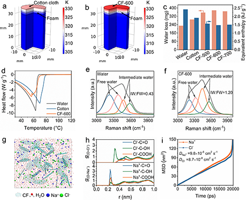 图5. COMSOL模拟a) 棉布和b) CF-600。c) 不同蒸发器在黑暗中的质量损失和蒸发焓。d) 不同蒸发器的DSC曲线。e) 纯水和f) CF-600的拉曼光谱。g) CF-600与3.5 wt% NaCl溶液的MD图。h) Na+和Cl-与CF-600中含氧基团的RDF图。i) Na+和Cl-的MSD图