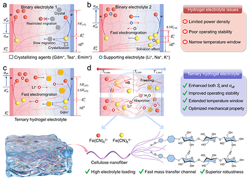 柔性凝胶热电池(GTC)提供了一种安全、简便、可扩展的直接热能到电能转换方法。鉴于其连续的工作模式和对动态人机界面的适应性,GTC在自供电可穿戴电子领域中显示出巨大的应用潜力,特别是在快速扩展的全球物联网市场的背景下。然而,为了使GTC在实际应用中切实可行,它们应该同时表现出(1)高热功率Si)和离子电导率,以实现高输出功率密度;(2)抗冻和抗干燥性,以适应各种操作环境,以及(3)优异的机械韧性,以支持柔性可穿戴设备长期服役。通常情况下,高Si是通过诱导氧化还原离子热敏结晶以形成高的浓度梯度来实现的,机械强度是通过增加聚合物链的交联密度或引入额外的交联位点来提高的。然而,这些方法往往阻碍了活性离子的输运而损害有效离子电导率,从而限制高功率密度。此外,传统的凝胶电解质对各种操作环境的适应性较差,在干燥和冰冻温度等极端条件下面临挑战。