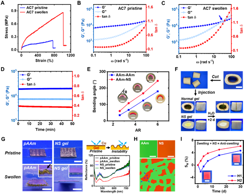 上述凝胶的负溶胀行为受多种材料体系自身参数与环境因素影响。实验中对于反应物结构、反应物配比等对产物负溶胀热力学与动力学的影响规律进行了研究,阐明了其作用机理并对负溶胀的发生速率与程度进行了大幅优化。同时还研究了真实环境条件,如温度、pH、离子浓度等对负溶胀的影响,明确了负溶胀适用的条件范围并建立了基于环境因素进一步强化负溶胀的有效策略(图2)。