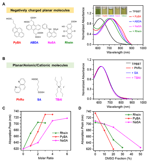基于此,香港中文大学(深圳)唐本忠院士、华中科技大学大罗亮教授、李忠安教授联合研究团队合成了一种苯并双噻二唑为受体的多阳离子光热诊疗剂(TPBBT)。TPBBT可以自组装形成H/J混合聚集体,其吸收峰会发生轻微的红移(图 1A)。值得注意的是,基于TPBBT的平面结构和带正电荷的特性,TPBBT与正电荷分子、中性分子和带平面结构分子作用时,其吸收波长几乎不发生变化(图2)。TPBBT与带负电的平面小分子共组装,其吸收波长红移80-100 nm(图2)。TPBBT与具有多种生物活性的大黄酸也可经共组装(TPBBTein),从而使TPBBT的最大吸收波长红移约80 nm。单晶 X 射线衍射分析揭示大黄酸通过 π-π 堆叠与静电相互作用,诱导 TPBBT 从H/J 混合聚集体(图3)转变为高度有序的J-聚集体(图4)。因此,在 808 nm激光照射下,TPBBTein的光热转换效率高达60.4%,大大超过了TPBBT自组装溶液(6.4%)。更引人注目的是,在光热效应下,TPBBTein 还能显著增加肿瘤细胞对大黄酸的摄取,从而实现超高效光热治疗-化疗协同治疗,进而彻底消除肿瘤(图 1B)。