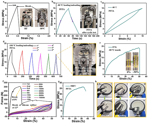 弹性体材料在工业、医疗等诸多领域具有重要应用价值,但其在极端低温(如温度低于-80 ℃)、长期老化及溶剂侵蚀等复杂环境下的性能不足严重限制了实际应用。针对这一挑战,香港中文大学(深圳)朱世平、朱贺团队设计并制备了一种基于全氟聚醚(PF)软段与邻苯二酚功能化扩链剂(TPA)的聚氨酯弹性体(PFTA)。该材料具有较低的玻璃化转变温度(约为?115 ℃)、优异的抗老化性能且在多种常见溶剂中均表现出极低溶胀率。