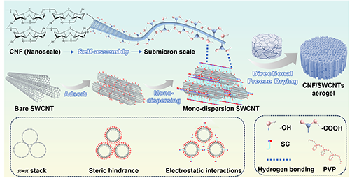 优化单壁碳纳米管(SWCNTs)在纤维素纳米纤维(CNF)气凝胶中的分散是实现增强微波吸收和多功能性的关键。同样重要的是确保这些材料的机械耐久性和长期稳定性。本文报道了一种结合球磨辅助单分散和自组装技术的制备策略,以优化气凝胶的结构。在球磨过程中,SWCNTs通过静电斥力和位阻均匀分散,而自组装过程改变CNF的内部氢键,以防止过度致密化,随后SWCNTs和CNF通过氢键作用形成了三维网络。定向冷冻干燥产生了具有仿生蜘蛛网状结构的轻质弹性复合气凝胶。优化后的气凝胶具有优异的电磁波吸收性能,最小反射损耗(RLmin)为?38.9 dB,有效吸收带宽(EAB)为8.5 GHz,最大雷达横截面(RCS)降低34.44 dB?m2。此外,这些气凝胶表现出显著的机械弹性,在极端条件下(-20?C),在50次压缩循环中保持高达86.1%的初始应力。结合其优异的隔热和热红外性能,该气凝胶为先进的EMW管理和多功能应用提供了巨大的潜力。