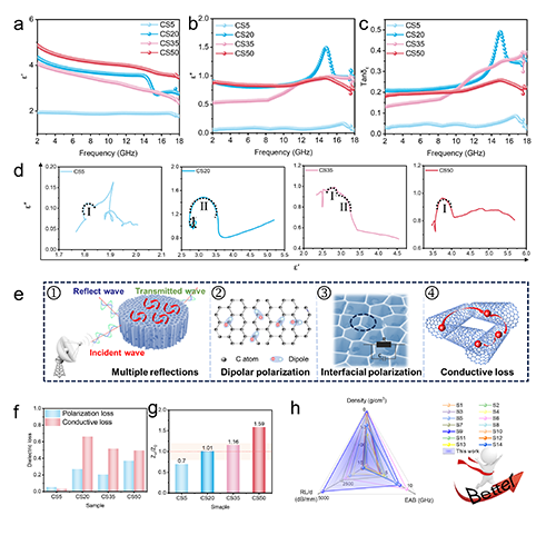 图4 介电常数a实部(ε′),b虚部(ε′),c介电损耗正切部(tanδε), d Cole-Cole圆,e CS气凝胶的微波吸收机理。f电导率损耗和极化损耗的贡献程度。CS气凝胶的|Zin/Z0|值。h CS气凝胶与其他类型气凝胶EMW吸收性能比较。