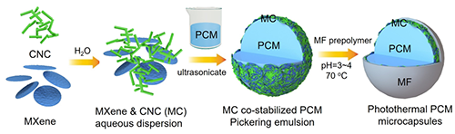 图 1.MC共稳定Pickering乳液及其作为模板制备光热PCM微胶囊的示意图。