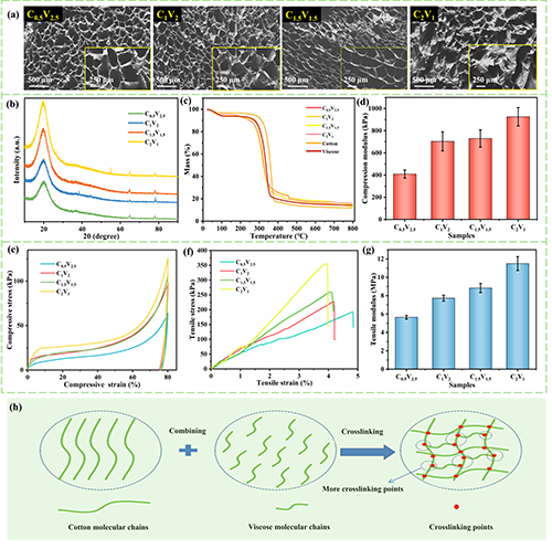 如图4所示,探究了棉/粘不同组合比例对气凝胶力学性能的影响,并分析了增强机理。纤维素基材料的机械性能受纤维素聚合度(DP)影响显著,高DP棉纤维赋予气凝胶网络机械强度,低DP粘胶增加纤维素交联点。研究发现混合气凝胶的网络比单一的棉/粘气凝胶更均匀,有利于提高力学性能;与3 wt%纯粘胶纤维气凝胶相比,棉/粘胶组合气凝胶(C2V1)的压缩应力和模量分别提高了2.3倍和13.1倍。