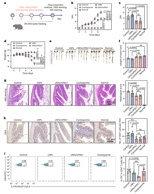 研究团队随后对LNPs/mPDL1在另一自身免疫疾病——溃疡性结肠炎(UC)模型的治疗效果进行了评估。C57BL/6小鼠经DSS诱导后出现严重结肠缩短(平均长度5.6 cm)和黏膜损伤。LNPs/mPDL1治疗组结肠长度恢复至正常水平(6.6 cm),且黏膜结构完整,隐窝破坏显著缓解,且其治疗效果与环孢素相当。同时LNPs/mPDL1治疗显著减少肠道炎症部位的CD4+ 和CD8+ T细胞浸润,增加了Treg数量,并降低TNF-α水平;此外,研究团队还发现,LNPs/mPDL1显著降低了肠系膜、腹股沟淋巴结、脾脏和血液中的效应T细胞(图7)。