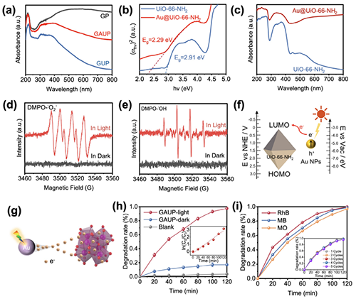 齐鲁工业大学(山东省科学院)于得海教授团队提出将金纳米粒子(Au NPs)和氨基功能化金属有机框架(UiO-66-NH2),引入氧化石墨烯复合膜(GO-Au@UiO-66-NH2-PSSA,简称GAUP),不仅优化了复合膜的离子传输通道,还赋予了膜材料光响应、抗菌和污染物降解等多功能特性。在光照条件下,Au NPs 的局域表面等离子共振(LSPR)效应促进了热电子的产生并提升了渗透能转换效率,使得 GAUP 膜的输出功率密度达到 16.5 W m-2。此外,该膜还表现出优异的污水处理能力,在光照下可实现 90% 以上的染料降解率,并对革兰氏阴性细菌展现 99% 的杀菌效果。GAUP膜成功解决了渗透能源系统和废水处理中的可持续性问题,是可持续纳米流体技术的重要突破,促进了可再生能源解决方案与环境管理的高度融合。