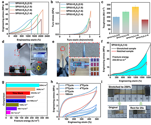 图5 SPUU-DS力学综合性能:应力-应变响应、6.0 kg承载、抗穿刺机制、缺口敏感性、断裂能及循环加载行为。