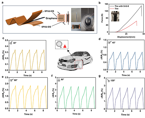 本工作受蜻蜓翅膀多级结构的启发,在动态酰基氨基脲基团中引入非匹配超分子相互作用(MMSIs),构建了SPUU-DS弹性体的刚柔互补型杂化网络。通过软段(类似柔性翅膜)与硬段(类似刚性翅脉)的协同作用机制,结合致密氢键阵列实现软硬段动态适配。制备的超分子弹性体断裂时的真应力为1.1 GPa,韧性为325.54 MJ/m3,断裂能为232.83 kJ/m2,同时还具有自修复性能。进一步将弹性体与石墨烯复合后制备了“三明治”结构的防护和监测传感,通过穿刺角度与电阻信号的智能关联特性,不仅可以提高轮胎的抗穿刺性能,还能对轮胎的损伤进行定位预警。