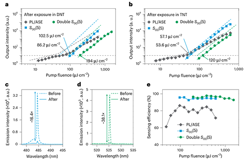 拉曼光学器件在爆炸物检测方面灵敏度惊人,如图5a和b所示,暴露在二硝基甲苯和三硝基甲苯亿分之一空气浓度蒸汽条件下5分钟后,ASE与一至二阶STGI-SRS信号的阈值显著增高,三阶STGI-SRS信号甚至无法探测到。STGI-SRS强度亦发生明显变化,经计算二硝基甲苯和三硝基甲苯的检测灵敏度分别达到95%和80%以上,一阶与二阶STGI-SRS的检测灵敏度显著高于ASE(图5c-e)。
