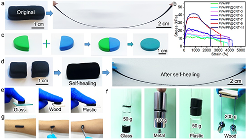 PVA/硼砂水凝胶作为一种亲水性高分子,能够通过氢键或化学键形成独特的三维网络结构。得益于硼酸酯键的动态可逆性,这种水凝胶展现出优异的柔韧性、可塑性、可拉伸性和自修复能力。更为重要的是,适量纳米材料的引入可以有效地耗散能量,从而显著提高水凝胶的机械强度。此外,随着生物医学应用朝着环保和可持续发展方向推进,基于生物质材料的生物相容性PSS技术在生物医学领域受到了广泛关注。因此,开发一种新型的导电且可拉伸的水凝胶,以制造高性能的柔性电子产品,依然是一项具有挑战性的任务。