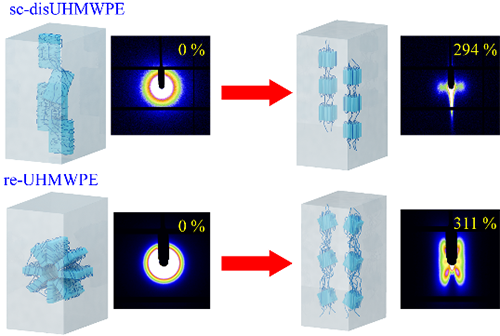溶液结晶获得的解缠结超高分子量聚乙烯(disUHMWPE)可以表现出大于100倍的超拉伸特性,使之可以用来制备世界上最轻最强的纤维。然而,他们近期的研究发现(Macromolecules 2024, 57, 21, 10240–10252),短时间的熔融即可使得缠结网络迅速恢复形成,导致超拉伸性能消失。然而针对单轴牵伸过程中缠结UHMWPE与解缠结UHMWPE晶体结构的演化规律依然缺少系统的比较研究。