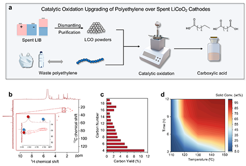 针对上述问题,苏州大学陈金星教授与中科院苏州纳米所徐盼盼副研究员合作,创新性地开发了基于废旧钴酸锂(LCO)正极的催化体系,成功实现废弃PE向高附加值二羧酸的高效转化。研究表明,该系统在130 oC下运行6 h,二羧酸的碳产率高达77.5 wt%。态密度分析和原位红外光谱分析共同揭示了钴自旋态与催化氧化性能之间的构效关系。