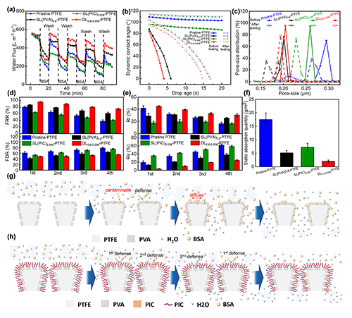 由于牛血清白蛋白(BSA)具有强的吸附污染性,所有膜样本的水通量在BSA的四次循环测试中都下降(图4a),但DL-PTFE膜在测试后仍然有最好的润湿性能(图4b),其孔径降低也最少(图4c),拥有最优的通量回复率(FRR)、通量衰减率(FDR)(图4d)及可逆污染率(Rr)、不可逆污染率(Rir)(图4e),此外,DL-PTFE膜在BSA静态吸附测试中也拥有最少的吸附量,这是由于其避免了“单一防御”策略中污染物在跨膜压力下的黏附(图4g),进一步证明了DL-PTFE膜表面水凝胶构建的水合层协同两性离子刷共同作用(图4h),大幅提升了膜的防污性能。
