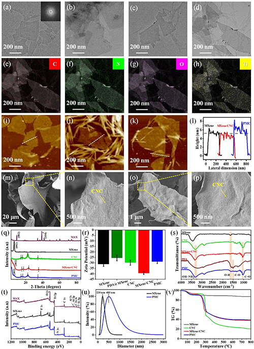 Figure 2. TEM image of (a) MXene, (b) PDA@MXene, (c) MXene/CNC, and (d) PMC. The (e) C, (f) N, (g) O, and (h) Ti elementary mappings of PMC. The AFM images of (i) MXene, (j) MXene/CNC and (k) PMC, and (l) their height morphology. The SEM images of freeze-dried (m & n) MXene/CNC and (o & p) PMC. (q) The XRD patterns of MAX, MXene, CNC, MXene/CNC, and PMC. (r) The zeta potential values of MXene, PDA@MXene, CNC, MXene/CNC, and PMC. (s) The FTIR spectra of MXene, CNC, MXene/CNC, PDA and PMC. (t) The XPS spectra of MAX, MXene, and PMC. (u) DLS results of MXene and PMC. (v) TGA curves of MXene, CNC, MXene/CNC, and PMC.