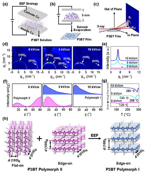 图1. (a,b) 外加电场示意图。(c)2D-GIWAXS示意图。(d-f) 不同电场强度下P3BT薄膜的2D-GIWAXS图、1D-GIWAXS图以及极图。(g)不同电场强度下P3BT薄膜的 DSC曲线。(h) P3BT薄膜晶型结构及结晶取向转变的链堆积示意图。
