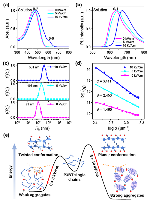 图3. (a,b)不同电场强度下P3BT溶液的紫外-可见吸收光谱和荧光光谱。(c)不同电场强度下P3BT溶液的流体力学半径分布。(d) 不同电场强度下P3BT溶液的log I(q)与log q关系,聚集体的分形维数(df)由log I(q)与log q线性拟合后的斜率获得。(e) P3BT在溶液中不同状态下的链构象和聚集结构示意图。