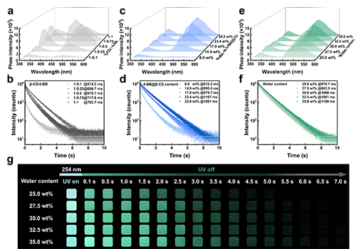图4. PAETC/4-BB@β-CD水凝胶的光物理性质。(a-b) 不同β-CD/4-BB摩尔比的PAETC/4-BB@β-CD水凝胶的延迟发光光谱和磷光寿命衰减曲线。(c-d) 不同4-BB@β-CD比例的PAETC/4-BB@β-CD水凝胶的延迟发光谱和磷光寿命衰减曲线。(e-f) 不同水含量的PAETC/4-BB@β-CD水凝胶的延迟发光谱和磷光寿命衰减曲线。(g) 不同含水量的PAETC/4-BB@β-CD水凝胶的发光性能照片。
