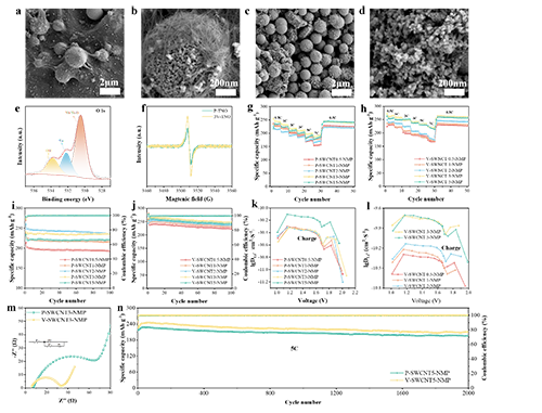 图3: 图3 a-b)P-SWCNT3-NMP的扫描电子显微镜图;c - d)V-SWCNT3-NMP的扫描电子显微镜图;e)V - SWCNT3 - NMP的X射线光电子能谱高分辨率e)O 1s光谱;f)P - TNO和V - TNO的电子顺磁共振光谱;g - h)P - SWCNTx - NMP和V - SWCNTx - NMP电极的倍率性能;i - j)P - SWCNTx - NMP和V - SWCNTx - NMP在0.1C下的循环性能;k - l)P-SWCNTx-NMP and V-SWCNTx-NMP电极的DLi+;m)SWCNT3-NMP and V-SWCNTx-NMP的电化学阻抗谱拟合结果;n)PSWCNT5 - NMP和V-SWCNT5-NMP在5C下的循环性能。