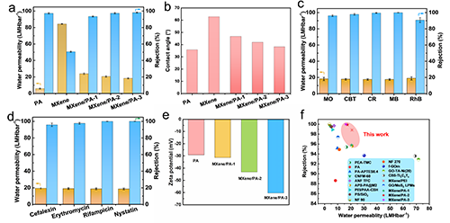 图4. 膜性能表征: (a) 水通量与Na2SO4截留率; (b) 水接触角; (c) 染料截留性能; (d) 抗生素截留性能; (e) Zeta电位 (pH=7); (f) 与文献数据的性能对比
