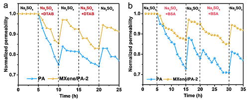 图6. 抗污染性能测试: (a) DTAB及 (b) BSA污染过程中纯PA膜与MXene/PA-2膜的归一化水通量衰减曲线