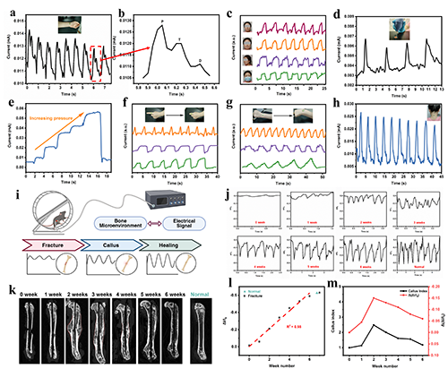 研究团队通过一系列实验展示了该传感器的广泛应用前景。在医疗监测方面,传感器能够准确检测腕部脉搏波形(图2),单个脉搏周期中可清晰识别冲击波、潮波和舒张波三个特征波形,为心血管疾病诊断提供了潜在工具。在骨折愈合监测这一创新应用中,研究人员将传感器固定在小鼠骨折部位,通过检测小鼠运动时产生的电流信号变化,成功追踪了骨折愈合过程。结果显示,电流变化值与愈合周数呈高度线性关系(R2 = 0.98),与Micro-CT成像结果一致,为骨折愈合提供了一种无创、便携的监测方法。在呼吸监测方面,将传感器置于口罩内,可在吸气时显示红色(约22.3°C),呼气时变为黄绿色(约28.4-30.3°C),同时电流信号也随呼吸变化,能够检测到持续时间不同的屏气周期,在睡眠呼吸暂停综合征识别方面具有潜力。在人机交互领域,研究团队还制备了2×2传感器阵列,能够同时检测压力和温度的空间分布。当手指按压时,接触区域颜色从红变绿,且不同区域呈现不同的电流响应,展示了在智能假肢和可穿戴皮肤电子设备中的应用前景。