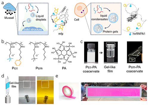 水下/油下黏附是海洋工程、生物医学以及能源工业中的核心需求,但传统胶粘剂在潮湿环境中极易失效。相比之下,自然界中的贻贝等生物却能在水中稳固附着,其奥秘在于足丝蛋白序列中均匀分布的阳离子和芳香基团使其可以通过液-液相分离形成凝聚液滴,并进一步发生液-固转变,构筑出具备强黏附性的聚合物网络结构。