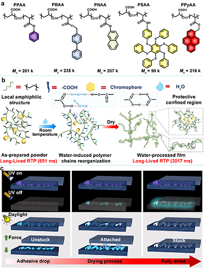 复旦大学高分子科学系的朱亮亮教授团队通过将不同的微量发光团无规共聚到聚丙烯酸主链中,制备出环保型长余辉发光胶黏剂。该团队提出了一种新颖的技术——水诱导的聚合物链重组。当聚合物经水处理后,其RTP信号都会变得更亮、更持久。这一过程可在室温下发生,形成对发光团具有保护作用的局部限域区域,使材料实现了在RTP聚合物领域中极为优异的余辉寿命,并在环境中具有较高的稳定性。