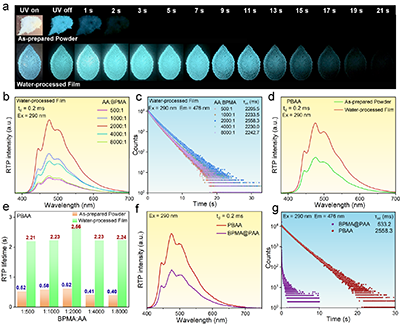 图2. (a) PBAA原始粉末与经水处理薄膜的余辉照片。(b, c) 不同投料比例下合成的PBAA薄膜的延迟光谱和寿命衰减曲线。(d) PBAA原始粉末与经水处理薄膜的延迟光谱。(e) 不同掺入比例下PBAA原始粉末与经水处理薄膜的室温磷光寿命。(f, g)PBAA与BPMA@PAA薄膜的延迟光谱和寿命衰减曲线。