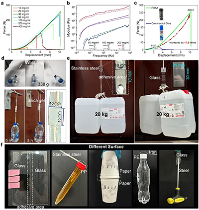 图4. (a) 不同浓度PBAA水溶液的力–位移曲线;(b) 动态力学频率扫描曲线。(c) PBAA与市售胶的力–位移对比。(d) PBAA胶黏剂可稳固粘合硅胶板,长时间承受悬挂负载。(e) 以PBAA胶黏剂粘合不锈钢板和玻片,可悬挂20 kg重物。(f) PBAA胶黏剂在多种材料表面均展现出优异的黏附性能。