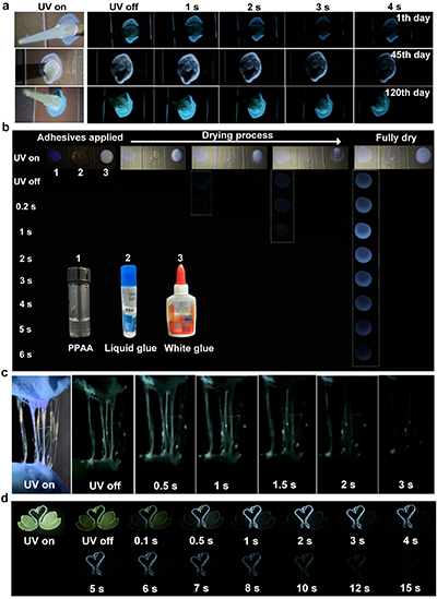 图5. (a) PBAA胶黏剂在日常湿度环境下放置120天的余辉照片。(b) PBAA与两种市售胶水在干燥过程中的发光表现。(c) PBAA溶液形成发光纤维的照片。(d)发光天鹅模型示意图。