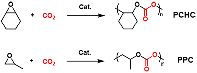 图1. 二氧化碳/环氧环己烷共聚物聚碳酸环己撑酯PCHC与二氧化碳/环氧丙烷共聚物聚碳酸亚丙酯PPC化学结构