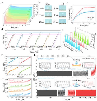 3凝胶的自愈性能表征a:保水性曲线。b:修复状态对比。脱水水凝胶泡纯水(左)20 分钟后仍有些干硬,泡二元溶剂(右)则完全恢复柔软。c:重量恢复曲线。泡二元溶剂的水凝胶重量恢复更慢但更稳定,因为甘油会和水竞争结合位点,避免水分快速流失。d:多次干燥-修复的应力-应变曲线。e6 次失水-修复循环的性能变化。f135 次修复后的应力-应变曲线。g:加载-卸载滞后曲线。随着应变增加,滞后环变大,说明水凝胶能吸收能量,且多次修复后滞后环形状一致。h:传感稳定性对比。