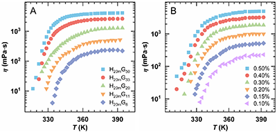 图4. H20mG11在不同聚合物浓度(0.05–0.5%)下的热增黏能力。(A)黏—温曲线;(B) Regime II 区间lnη–1/T的Cross 模型拟合;(C)以0.5%为参照,通过移位因子aC和bC得到的时间–CP叠加曲线;(D) Regime II 中η–T关系的Gompertz模型拟合。