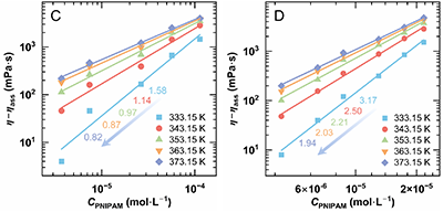 通过黏度差η -ηass表征PNIPAM热缔合对增黏的贡献,并以CPNIPAM建立标度关系。在333.15 K 参考温度下对Group 2和Group 3进行时间–温度叠加,得到bT(ηmax-ηass)曲线:在低CPNIPAM区间,两条曲线几乎重合,说明热缔合增黏贡献相近;而在高CPNIPAM下,Group 3的bT(ηmax-ηass)明显高于Group 2,对应标度指数分别为2.78 和1.10。这表明在相同PNIPAM片段浓度下,提高主链浓度(Cp)比单纯增加接枝率(Gr)能更有效地放大热缔合增黏效应。