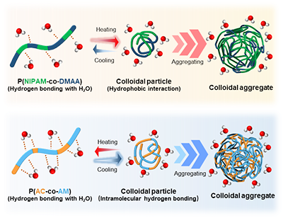 近期,浙江大学生物系统工程与食品科学学院张辉教授团队设计并构建了一种由两种温敏共聚物组成的液态纳米胶体系统;通过将具有低临界溶解温度(LCST)的p(NIPAM-co-DMAA)与具有高临界溶解温度(UCST)的p(AC-co-AM)共分散于PEG/水二元溶剂中,实现了在同一材料体系内对加热与冷却刺激的双向可逆响应(图2);并利用PEG诱导的cononsolvency效应调控两组分的相变温度,使温敏变色范围覆盖?9°C至85°C的宽温域。