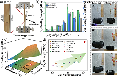 研究团队发布的新型DLT 胶粘剂在强度与耐久性上与常见的生物基胶和石化树脂相比均展现出明显优势。其高性能源于活化木质素与 TMPTE 的协同固化机制,使胶层在干态与湿态均表现出显著的结构稳定性,在沸水浸泡后依旧保持完好。研究确定了最佳配方与工艺:1:1 配比、适中施胶量与合理热压条件,可显著增强界面固化质量。显微观察显示,DLT 能深入渗透木材并显著提升基材刚度,且在多轮湿/干循环中仍保持牢固结合,展现出优异的界面稳定性与工业化应用前景。