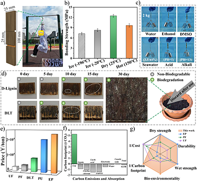 DLT 生物胶在可靠性与可持续性方面表现突出:其搭接的木板可承载 70 kg 成人,并在 ?196 ℃ 至 150 ℃ 的极端温度下保持 7–10 MPa 的高强度,远超行业标准(0.7 MPa)。样品在水、乙醇、DMSO、海水及强酸强碱中浸泡 7 天后保持结构完好,适用于高湿与腐蚀环境;废弃板材在户外土壤中 15–30 天即可出现丰富真菌菌丝,显示良好生物降解性。DLT其碳足迹仅 0.158 t CO? eq/t,显著优于 UF、PF、EP。凭借高性能、强耐候、低成本与低排放等优势,DLT 有望成为结构木制品领域具竞争力的石化替代方案。