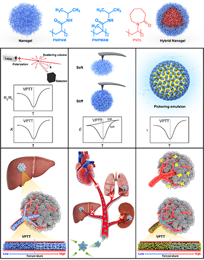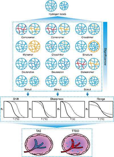 1. 纳米凝胶的体积相变行为在经导管动脉栓塞术和肿瘤靶向药物递送等定制化生物医学应用中的合理设计。