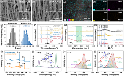 该研究通过多尺度取向铠甲化构筑策略,实现了从分子链与偶极取向调控到纳米纤维网络结构稳定化的跨尺度构筑。在静电纺丝过程中引入立构复合晶作为取向与交联单元,在高压电场与高速牵伸协同作用下,不仅提升了纤维成形稳定性,还诱导聚乳酸分子链、C=O偶极及纳米纤维沿轴向高度取向,并显著增强了纤维结构有序性与耐高温能力。以取向纤维为铠甲化基底,将氨基修饰的高选择性MOF晶体均匀锚定于纤维表面,显著提升材料对CO2、SO2等有毒气体的吸附能力,并构筑稳定的纤维–晶体协同界面。界面诱导极化效应实现电荷持续积累,使膜在保持良好通透性的同时协同实现颗粒物高效过滤与气体污染物选择性去除,为火场等严苛环境下的高效呼吸防护提供坚实基础。